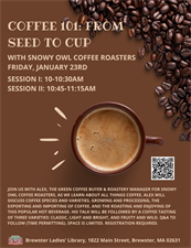 Join us with Alex, the Green Coffee Buyer & Roastery Manager for Snowy Owl Coffee Roasters, as we learn about all things coffee. Alex will discuss coffee species and varieties, growing and processing, the exporting and importing of coffee, and the roasting and enjoying of this popular hot beverage. His talk will be followed by a coffee tasting of three varieties: Classic, Light and Bright, and Fruity and Wild. Q&A to follow (time permitting).