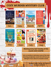 Do you dream of improbable circumstances that lead to mysterious deaths? Are you in the unknowing possession of a map to a silver mine hidden in the frame of an antique painting? Does your cat often lead you into situations that lead to the tragic murders of others? If so, you may enjoy Cozy Murder Mystery Book Club, the last Tuesday of each month, from 3-4 pm.